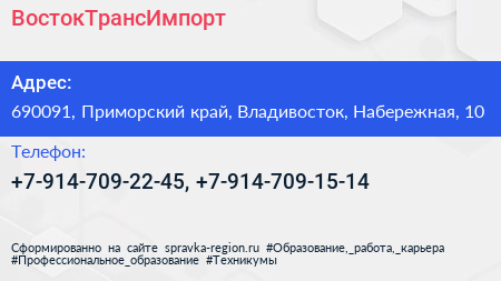 ВостокТрансИмпорт по адресу 690091, Приморский край, Владивосток, Набережная, 10 в дальнейшем Организация, размещена в следующих категориях: