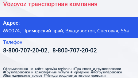 Vozovoz, транспортная компания по адресу 690074, Приморский край, Владивосток, Снеговая, 55а в дальнейшем Организация, размещена в следующих категориях: