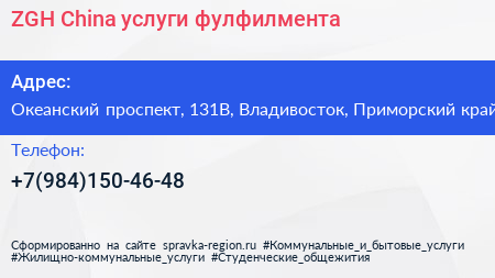 ZGH Chinа - услуги фулфилмента по адресу Океанский проспект, 131В, Владивосток, Приморский край в дальнейшем Организация, размещена в следующих категориях: