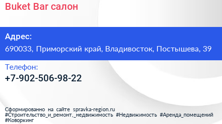 Buket Bar, салон по адресу 690033, Приморский край, Владивосток, Постышева, 39 в дальнейшем Организация, размещена в следующих категориях: