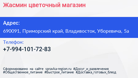 Жасмин, цветочный магазин по адресу 690091, Приморский край, Владивосток, Уборевича, 5а в дальнейшем Организация, размещена в следующих категориях: