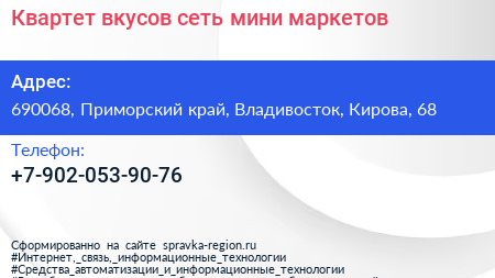 Квартет вкусов, сеть мини-маркетов по адресу 690068, Приморский край, Владивосток, Кирова, 68 в дальнейшем Организация, размещена в следующих категориях: