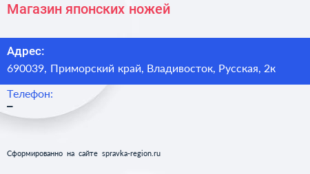 Магазин японских ножей по адресу 690039, Приморский край, Владивосток, Русская, 2к в дальнейшем Организация, размещена в следующих категориях: