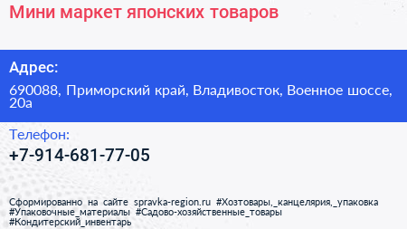 Мини-маркет японских товаров по адресу 690088, Приморский край, Владивосток, Военное шоссе, 20а в дальнейшем Организация, размещена в следующих категориях: