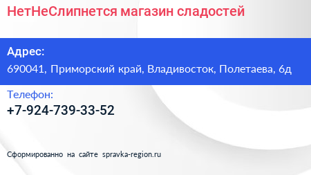 НетНеСлипнется!, магазин сладостей по адресу 690041, Приморский край, Владивосток, Полетаева, 6д в дальнейшем Организация, размещена в следующих категориях: