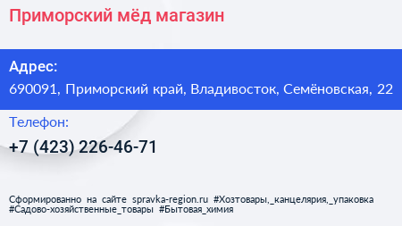 Приморский мёд, магазин по адресу 690091, Приморский край, Владивосток, Семёновская, 22 в дальнейшем Организация, размещена в следующих категориях: