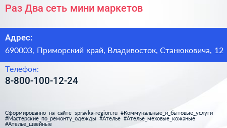 Раз Два, сеть мини-маркетов по адресу 690003, Приморский край, Владивосток, Станюковича, 12 в дальнейшем Организация, размещена в следующих категориях:
