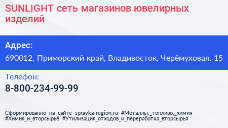 SUNLIGHT, сеть магазинов ювелирных изделий по адресу 690012, Приморский край, Владивосток, Черёмуховая, 15 в дальнейшем Организация, размещена в следующих категориях: