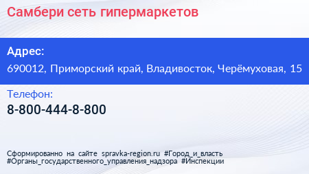 Самбери, сеть гипермаркетов по адресу 690012, Приморский край, Владивосток, Черёмуховая, 15 в дальнейшем Организация, размещена в следующих категориях: