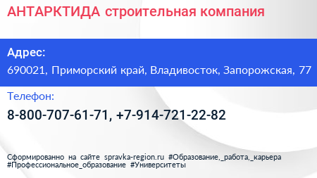 АНТАРКТИДА, строительная компания по адресу 690021, Приморский край, Владивосток, Запорожская, 77 в дальнейшем Организация, размещена в следующих категориях:
