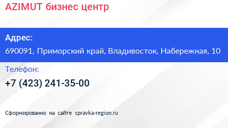 AZIMUT, бизнес-центр по адресу 690091, Приморский край, Владивосток, Набережная, 10 в дальнейшем Организация, размещена в следующих категориях: