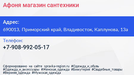 Афоня, магазин сантехники по адресу 690013, Приморский край, Владивосток, Каплунова, 13а в дальнейшем Организация, размещена в следующих категориях: