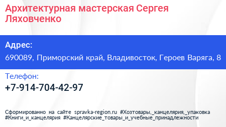 Архитектурная мастерская Сергея Ляховченко по адресу 690089, Приморский край, Владивосток, Героев Варяга, 8 в дальнейшем Организация, размещена в следующих категориях: