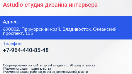 Astudio, студия дизайна интерьера по адресу 690002, Приморский край, Владивосток, Океанский проспект, 135 в дальнейшем Организация, размещена в следующих категориях: