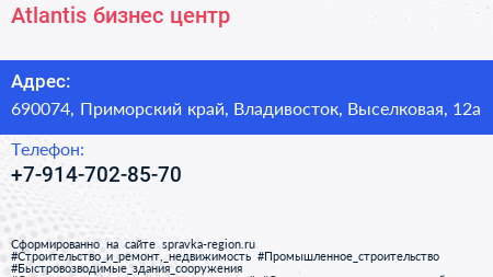 Atlantis, бизнес-центр по адресу 690074, Приморский край, Владивосток, Выселковая, 12а в дальнейшем Организация, размещена в следующих категориях: