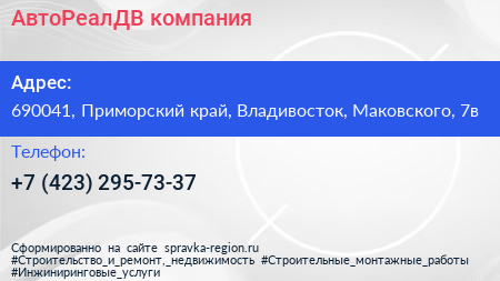 АвтоРеалДВ, компания по адресу 690041, Приморский край, Владивосток, Маковского, 7в в дальнейшем Организация, размещена в следующих категориях: