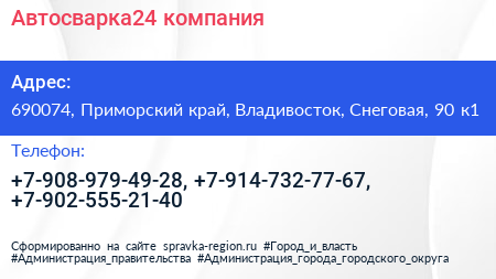 Автосварка24, компания по адресу 690074, Приморский край, Владивосток, Снеговая, 90 к1 в дальнейшем Организация, размещена в следующих категориях: