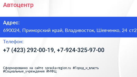 Автоцентр по адресу 690024, Приморский край, Владивосток, Шевченко, 24 ст2 в дальнейшем Организация, размещена в следующих категориях: