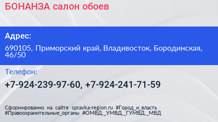 БОНАНЗА, салон обоев по адресу 690105, Приморский край, Владивосток, Бородинская, 46/50 в дальнейшем Организация, размещена в следующих категориях: