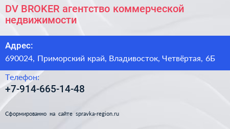 DV BROKER, агентство коммерческой недвижимости по адресу 690024, Приморский край, Владивосток, Четвёртая, 6Б в дальнейшем Организация, размещена в следующих категориях: