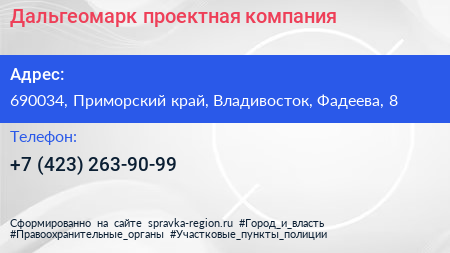 Дальгеомарк, проектная компания по адресу 690034, Приморский край, Владивосток, Фадеева, 8 в дальнейшем Организация, размещена в следующих категориях: