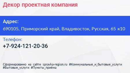 Декор, проектная компания по адресу 690105, Приморский край, Владивосток, Русская, 65 к10 в дальнейшем Организация, размещена в следующих категориях: