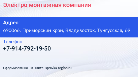 Электро, монтажная компания по адресу 690066, Приморский край, Владивосток, Тунгусская, 69 в дальнейшем Организация, размещена в следующих категориях: