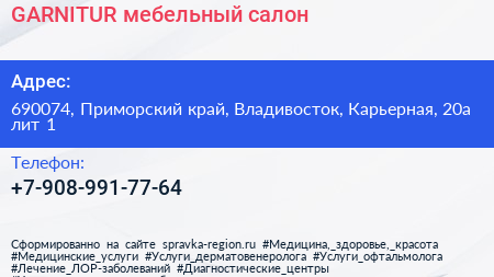 GARNITUR, мебельный салон по адресу 690074, Приморский край, Владивосток, Карьерная, 20а лит 1 в дальнейшем Организация, размещена в следующих категориях: