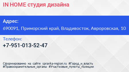 IN HOME, студия дизайна по адресу 690091, Приморский край, Владивосток, Авроровская, 10 в дальнейшем Организация, размещена в следующих категориях: