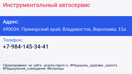 Инструментальный, автосервис по адресу 690034, Приморский край, Владивосток, Воропаева, 11а в дальнейшем Организация, размещена в следующих категориях: