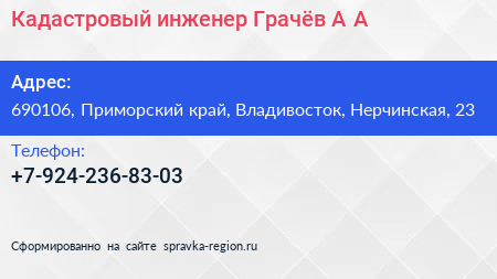 Кадастровый инженер Грачёв А.А. по адресу 690106, Приморский край, Владивосток, Нерчинская, 23 в дальнейшем Организация, размещена в следующих категориях: