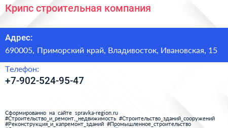Крипс, строительная компания по адресу 690005, Приморский край, Владивосток, Ивановская, 15 в дальнейшем Организация, размещена в следующих категориях: