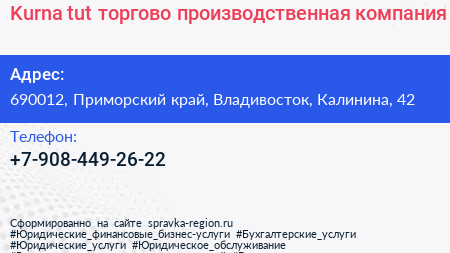 Kurna-tut, торгово-производственная компания по адресу 690012, Приморский край, Владивосток, Калинина, 42 в дальнейшем Организация, размещена в следующих категориях: