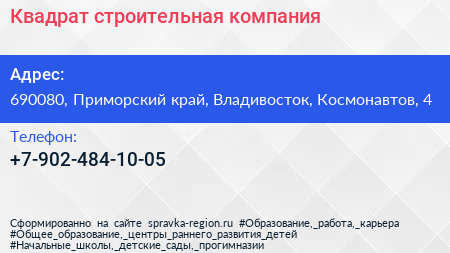 Квадрат, строительная компания по адресу 690080, Приморский край, Владивосток, Космонавтов, 4 в дальнейшем Организация, размещена в следующих категориях: