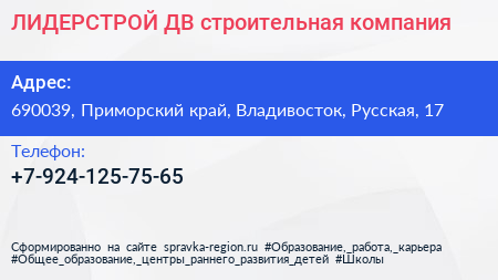 ЛИДЕРСТРОЙ-ДВ, строительная компания по адресу 690039, Приморский край, Владивосток, Русская, 17 в дальнейшем Организация, размещена в следующих категориях: