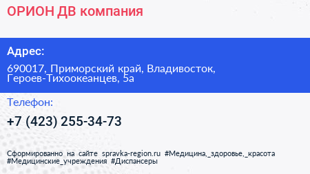 ОРИОН ДВ, компания по адресу 690017, Приморский край, Владивосток, Героев-Тихоокеанцев, 5а в дальнейшем Организация, размещена в следующих категориях: