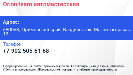Orion team, автомастерская по адресу 690068, Приморский край, Владивосток, Магнитогорская, 12 в дальнейшем Организация, размещена в следующих категориях:
