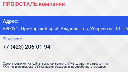 ПРОФСТАЛЬ, компания по адресу 690091, Приморский край, Владивосток, Уборевича, 10 ст9 в дальнейшем Организация, размещена в следующих категориях: