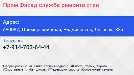 Прим Фасад, служба ремонта стен по адресу 690087, Приморский край, Владивосток, Луговая, 83а в дальнейшем Организация, размещена в следующих категориях:
