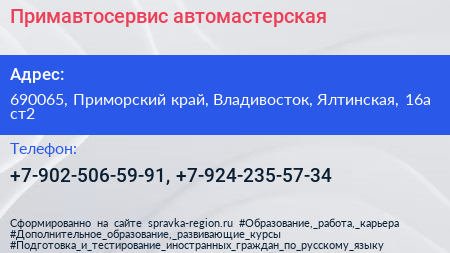 Примавтосервис, автомастерская по адресу 690065, Приморский край, Владивосток, Ялтинская, 16а ст2 в дальнейшем Организация, размещена в следующих категориях: