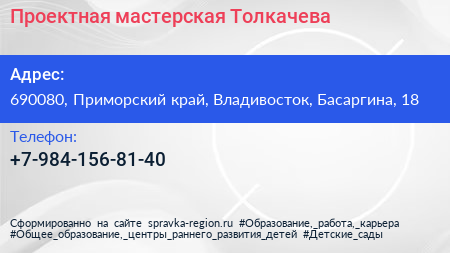 Проектная мастерская Толкачева по адресу 690080, Приморский край, Владивосток, Басаргина, 18 в дальнейшем Организация, размещена в следующих категориях: