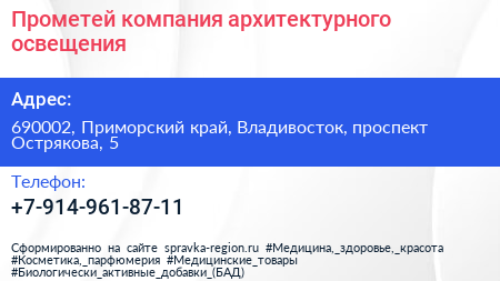 Прометей, компания архитектурного освещения по адресу 690002, Приморский край, Владивосток, проспект Острякова, 5 в дальнейшем Организация, размещена в следующих категориях: