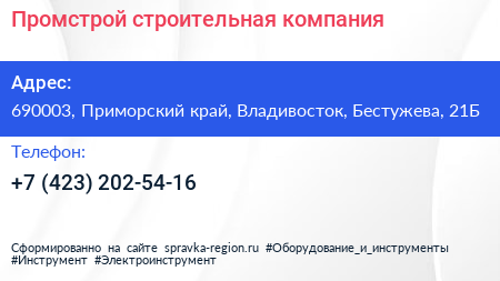 Промстрой, строительная компания по адресу 690003, Приморский край, Владивосток, Бестужева, 21Б в дальнейшем Организация, размещена в следующих категориях: