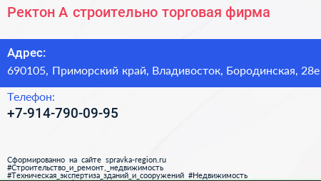 Ректон-А, строительно-торговая фирма по адресу 690105, Приморский край, Владивосток, Бородинская, 28е в дальнейшем Организация, размещена в следующих категориях: