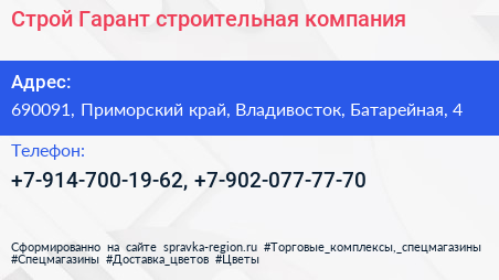 Строй Гарант, строительная компания по адресу 690091, Приморский край, Владивосток, Батарейная, 4 в дальнейшем Организация, размещена в следующих категориях: