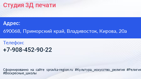 Студия 3Д печати по адресу 690068, Приморский край, Владивосток, Кирова, 20а в дальнейшем Организация, размещена в следующих категориях: