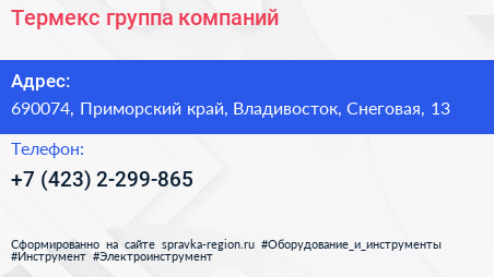Термекс, группа компаний по адресу 690074, Приморский край, Владивосток, Снеговая, 13 в дальнейшем Организация, размещена в следующих категориях: