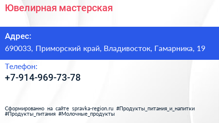 Ювелирная мастерская по адресу 690033, Приморский край, Владивосток, Гамарника, 19 в дальнейшем Организация, размещена в следующих категориях: