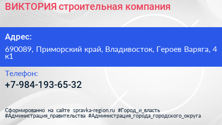 ВИКТОРИЯ, строительная компания по адресу 690089, Приморский край, Владивосток, Героев Варяга, 4 к1 в дальнейшем Организация, размещена в следующих категориях: