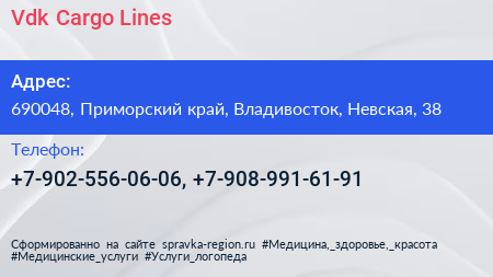 Vdk Cargo Lines по адресу 690048, Приморский край, Владивосток, Невская, 38 в дальнейшем Организация, размещена в следующих категориях: